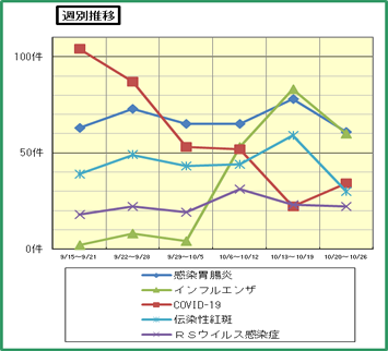 | 報告数292→224でした。 RSウイルス23→22、咽頭結膜熱4→1、A群溶連菌咽頭炎15→8、感染胃腸炎78→61、水痘1→1、手足口病1→2、伝染性紅斑59→30、突発性発疹3→4、ヘルパンギーナ3→0、流行性耳下腺炎(おたふくかぜ)0→1、インフルエンザ83→60、COVID-19 22→34でした。 今週のランキングは、1.感染性胃腸炎、2.インフルエンザ、3.COVID-19でした。 | |||