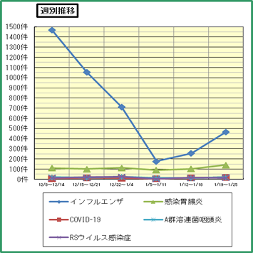 | 報告数420→683でした。 RSウイルス16→15、咽頭結膜熱2→3、A群溶連菌咽頭炎13→20、感染胃腸炎104→141、水痘3→4、手足口病2→0、伝染性紅斑7→7、突発性発疹0→7、ヘルパンギーナ0→0、流行性耳下腺炎(おたふくかぜ)1→0、インフルエンザ257→465、COVID-19 15→21でした。 今週のランキングは、1.インフルエンザ、2.感染性胃腸炎、3.COVID-19でした。 | |||