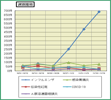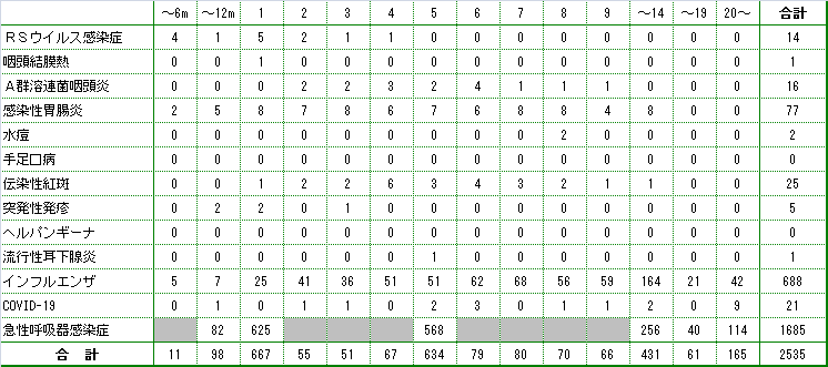 | 報告数659→850でした。 RSウイルス27→14、咽頭結膜熱3→1、A群溶連菌咽頭炎13→16、感染胃腸炎63→77、水痘1→2、手足口病0→0、伝染性紅斑17→25、突発性発疹8→5、ヘルパンギーナ1→0、流行性耳下腺炎(おたふくかぜ)1→1、インフルエンザ484→688、COVID-19 41→21でした。 今週のランキングは、1.インフルエンザ、2.感染性胃腸炎、3.伝染性紅斑でした。 | |||