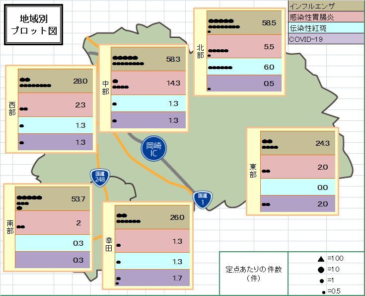 | 中部:マイコプラズマ 11件(8歳女、8歳女、5歳女、6歳女、7歳女、4歳男、5歳男、6歳男、7歳女、10歳女、12歳女)、病原性大腸菌O1 1件(6歳男)、インフルエンザA型 95件 南部:マイコプラズマ 3件(7歳女、7歳女、7歳男) 幸田:百日咳 1件(10歳女) 西部:マイコプラズマ 2件(5歳男、4歳女)、インフルエンザA型 29件 北部:マイコプラズマ 2件(7歳男、8歳男)、インフルエンザA型 117件 | |||