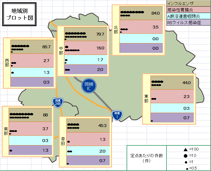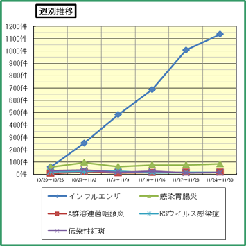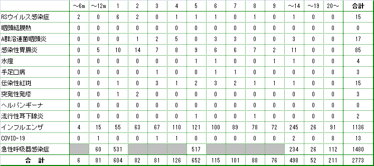 | 報告数1145→1293でした。 RSウイルス15→15、咽頭結膜熱1→0、A群溶連菌咽頭炎18→17、感染胃腸炎77→85、水痘0→4、手足口病1→3、伝染性紅斑12→15、突発性発疹3→3、ヘルパンギーナ0→0、流行性耳下腺炎(おたふくかぜ)1→2、インフルエンザ1008→1136、COVID-19 9→13でした。 今週のランキングは、1.インフルエンザ、2.感染性胃腸炎、3.A群溶連菌咽頭炎でした。 | |||